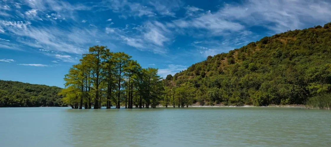 Водоем со знаменитыми кипарисами прекрасен в любое время года. В летний сезон тут приятно искупаться в озере, укрыться в тени реликтовых деревьев и дышать ароматом смолистой хвои. Холмы вдоль береговой линии укрыты зеленью можжевельника, скалистыми дубами. Особую климатическую зону создают предгорные сопки. Воздух пропитан ароматом кипарисов и прочих хвойных деревьев.