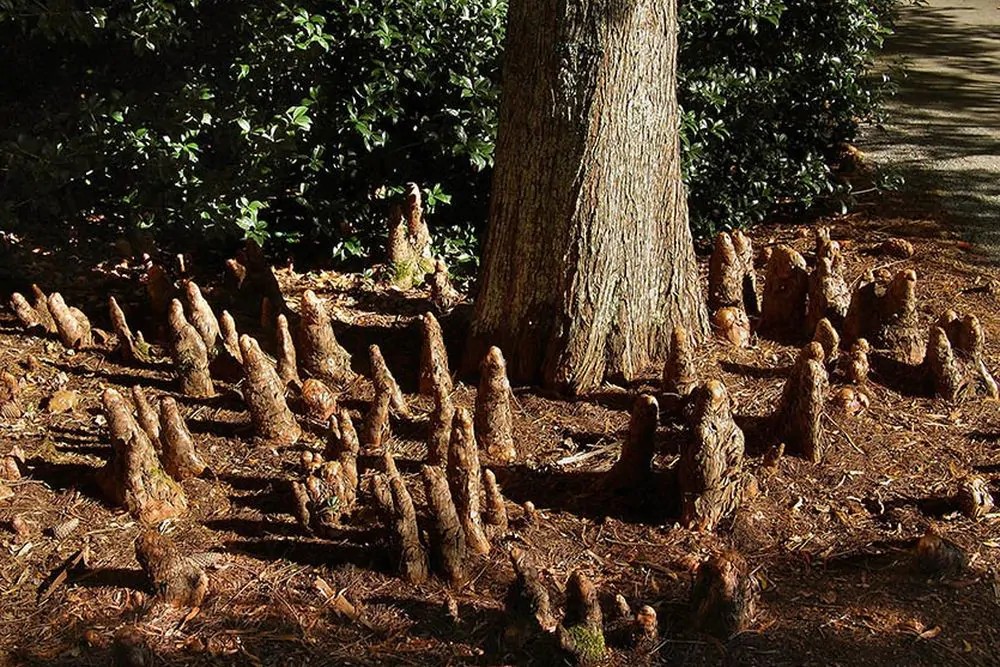 - Таксодиум двурядный(Taxodium distichum) или как его еще называют – болотный кипарис. Высота дерева – до 36 метров, ствол достигает до 5 метров в диаметре. Молодые культуры отличаются узкой кроной пирамидальной формы, взрослые – распростёртой. Кора у деревьев красно-коричневого оттенка, на корнях находятся своеобразные выросты, которые эффектно возвышаются. Объем шишек – до 4 см.