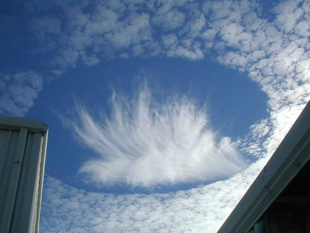 Вот как это объясняет Рэйчел Сторер: «Между 0°C и -40°C вода в воздухе может существовать во всех трех состояниях. Для образования воды и льда есть определенные температуры, но по факту в промежуточных атмосферных условиях намного легче формируется лед, а вода становится паром. Так вот, если в облаке происходит что-то, что нарушает его покой, например, пролетает самолет, это дает толчок к образованию льда. Ну а так как лед тяжелый, он падает на землю, а на его месте остается дыра».