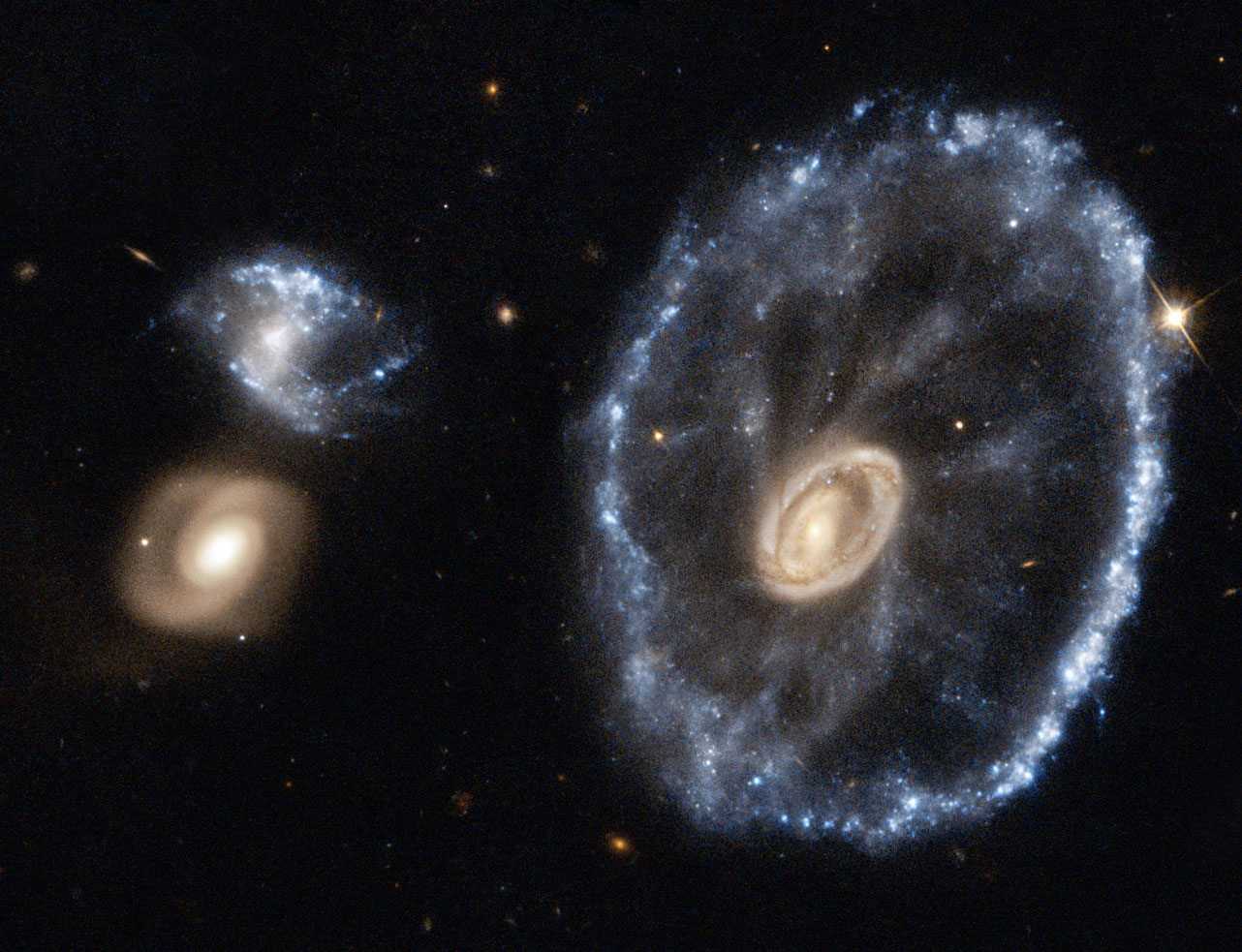 Но известны и другие кольцевые галактики. Первым, обнаруженным таким объектом, стало Колесо Телеги.