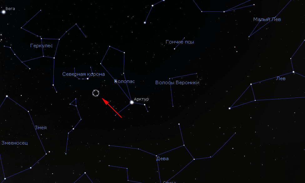 Итак, объект Хога — эта галактика, расстояние до неё около 600 миллионов световых лет. В поперечнике примерно 120 тысяч световых лет, что сравнимо по размеру с Млечным Путём. Если вы хотите её найти, то она находится в созвездии Змеи, вы можете посмотреть на фотографию ниже, которую мы для вас подготовили.
