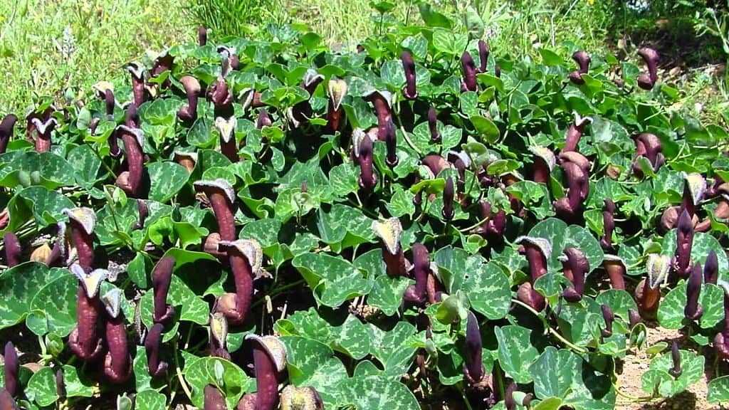 У Аристолохии гигантской цветы имеют темно-красный окрас и кремовые прожилки. От них исходит вонь, напоминающая мертвечину.