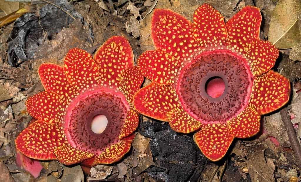 Это паразит, который прикрепляется к растению-хозяину с помощью нитевидных волокон и получает от последнего все необходимое. Цветок состоит из пяти ярко-красных лепестков с белыми бородавчатыми наростами. От Раффлезии исходит сильный аромат гниющей плоти. На него слетаются лесные пчелы и, увязая в соцветиях, способствуют опылению. Так как Раффлезия произрастает исключительно в джунглях, то из-за массовых вырубок может скоро исчезнуть с нашей планеты.
