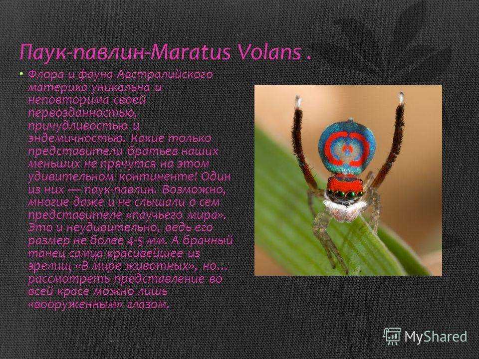 Паук-Павлин (Maratus volans). Это крошечный паук (не более 5 мм) из вида пауков скакунов. Эндемик Австралии. Славиться своим окрасом и сложным брачным поведение. У самца на брюшке имеются выросты (крылья), которые в покое складываются вокруг брюшка и расправляются при виде самки.