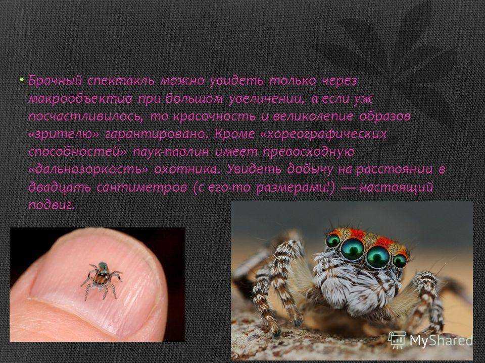 Брачный спектакль можно увидеть только через макрообъектив при большом увеличении, а если уж посчастливилось, то красочность и великолепие образов «зрителю» гарантировано. Кроме «хореографических способностей» паук-павлин имеет превосходную «дальнозоркость» охотника. Увидеть добычу на расстоянии в двадцать сантиметров (с его-то размерами!) настоящий подвиг.