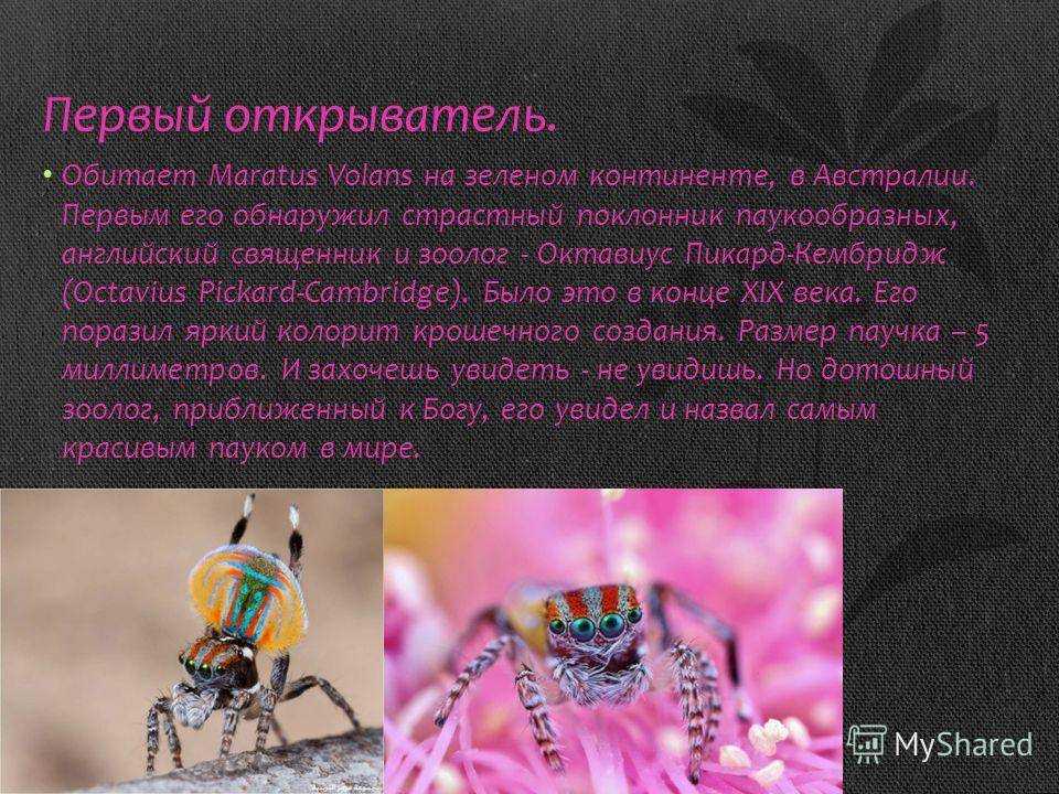Первый открыватель. Обитает Maratus Volans на зеленом континенте, в Австралии. Первым его обнаружил страстный поклонник паукообразных, английский священник и зоолог — Октавиус Пикард-Кембридж (Octavius Pickard-Cambridge). Было это в конце XIX века. Его поразил яркий колорит крошечного создания. Размер паучка – 5 миллиметров. И захочешь увидеть — не увидишь. Но дотошный зоолог, приближенный к Богу, его увидел и назвал самым красивым пауком в мире.