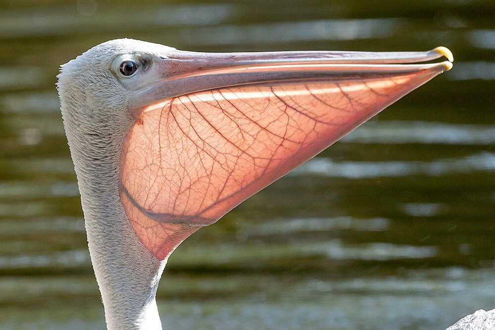 Клюв считается одной из наиболее выдающихся особенностей пеликанов. Их горловой мешок весьма объемный и имеет соединение с нижним клювом, откуда он свисает. Емкость такого кожного мешка составляет порядка 13 литров, что позволяет в полной мере использовать его как своеобразную сеть в момент водной охоты. Мешок закрывается с помощью длинного, наклоненного к низу верхнего клюва.