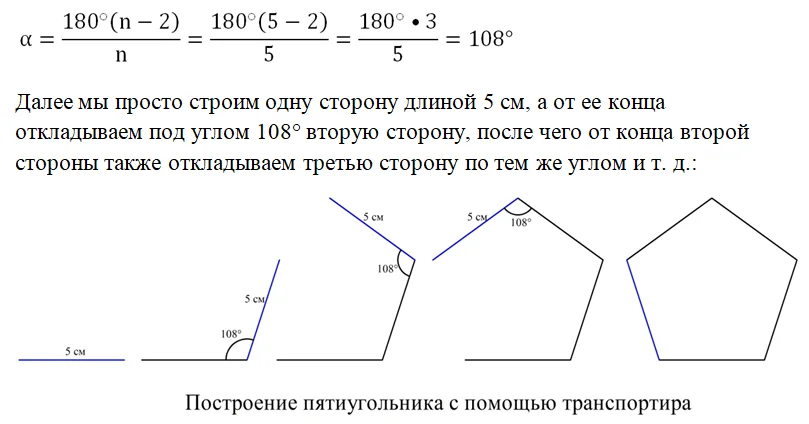 При использовании транспортира или иного прибора, позволяющего откладывать заранее заданные углы, построение правильного многоуг-ка проблем не вызывает. Например, пусть надо построить пятиугольник со стороной, равной 5 см. Сначала по известной формуле вычисляем величину его угла: