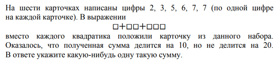 условие задачи подойдет 7 + 27 + 356 = 390.