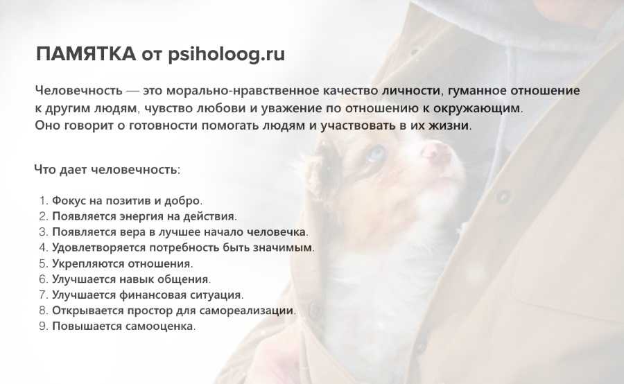 Это и стремление к справедливости, и честность, и уважение. Тот, кого можно назвать человечным, способен заботиться о других, помогать и опекать. Он может видеть в людях хорошее, подчеркивать их главные достоинства.