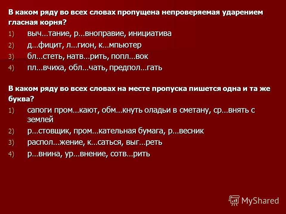 1. ПРОВЕРЯЕМЫЕ ГЛАСНЫЕ. Написание безударных гласных проверяется ударением. Нужно изменить слово так или подобрать такое родственное слово, чтобы ударение падало на сомнительный звук: голова — голову — голов; подарить — подарок, синева — синий.