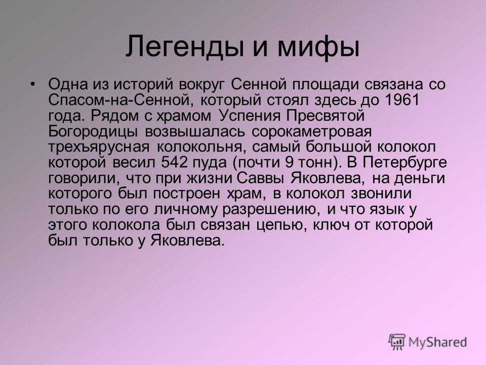 Легенды и мифы Одна из историй вокруг Сенной площади связана со Спасом-на-Сенной, который стоял здесь до 1961 года. Рядом с храмом Успения Пресвятой Богородицы возвышалась сорокаметровая трехъярусная колокольня, самый большой колокол которой весил 542 пуда (почти 9 тонн). В Петербурге говорили, что при жизни Саввы Яковлева, на деньги которого был построен храм, в колокол звонили только по его личному разрешению, и что язык у этого колокола был связан цепью, ключ от которой был только у Яковлева.
