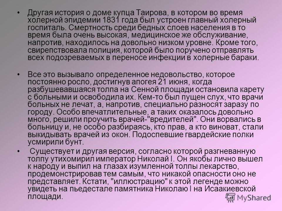 Другая история о доме купца Таирова, в котором во время холерной эпидемии 1831 года был устроен главный холерный госпиталь. Смертность среди бедных слоев населения в то время была очень высокая, медицинское же обслуживание, напротив, находилось на довольно низком уровне. Кроме того, свирепствовала полиция, которой было поручено отправлять всех подозреваемых в переносе инфекции в холерные бараки. Все это вызывало определенное недовольство, которое постоянно росло, достигнув апогея 21 июня, когда разбушевавшаяся толпа на Сенной площади остановила карету с больными и освободила их. Кем-то был пущен слух, что врачи больных не лечат, а, напротив, специально разносят заразу по городу. Особо впечатлительные, а таких оказалось довольно много, решили проучить врачей-«вредителей». Они ворвались в больницу и, не особо разбираясь, кто прав, а кто виноват, стали выкидывать врачей из окон. Подоспевшие гвардейские полки усмирили бунт. Существует и другая версия, согласно которой разгневанную толпу утихомирил император Николай I. Он якобы лично вышел к народу и выпил на глазах изумленной толпы лекарство, продемонстрировав тем самым, что никакой опасности оно не представляет. Кстати, «иллюстрацию» к этой легенде можно увидеть на пьедестале памятника Николаю I на Исаакиевской площади.