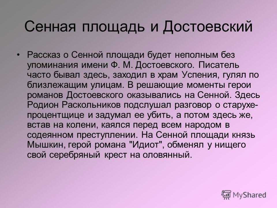 Сенная площадь и Достоевский Рассказ о Сенной площади будет неполным без упоминания имени Ф. М. Достоевского. Писатель часто бывал здесь, заходил в храм Успения, гулял по близлежащим улицам. В решающие моменты герои романов Достоевского оказывались на Сенной. Здесь Родион Раскольников подслушал разговор о старухе- процентщице и задумал ее убить, а потом здесь же, встав на колени, каялся перед всем народом в содеянном преступлении. На Сенной площади князь Мышкин, герой романа «Идиот», обменял у нищего свой серебряный крест на оловянный.