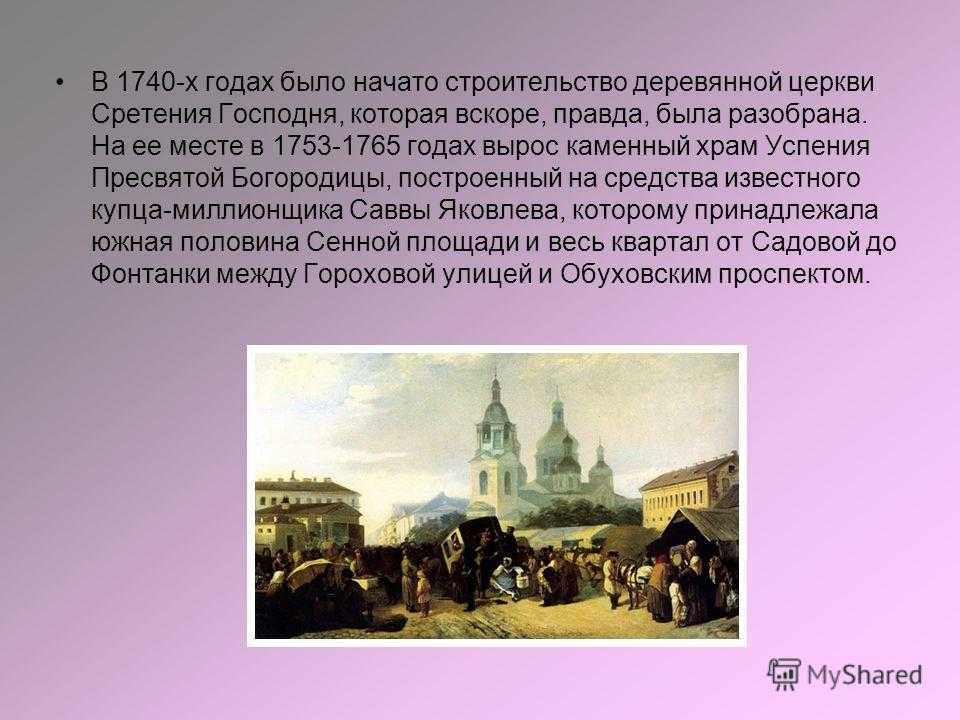 В 1740-х годах было начато строительство деревянной церкви Сретения Господня, которая вскоре, правда, была разобрана. На ее месте в годах вырос каменный храм Успения Пресвятой Богородицы, построенный на средства известного купца-миллионщика Саввы Яковлева, которому принадлежала южная половина Сенной площади и весь квартал от Садовой до Фонтанки между Гороховой улицей и Обуховским проспектом.