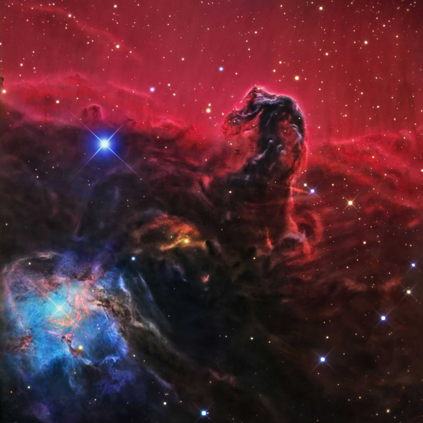Эта туманность называется IC 434 или Barnard 33. Сама туманность Конская голова является лишь самой темной частью самой яркой туманности IC 434. Она получила свое название из-за сходства с головой лошади и образована облаками пыли и газа на фоне ярко светящейся водородной туманности. Это одна из самых ярких туманностей, и ее фотографию часто можно найти в различных источниках.