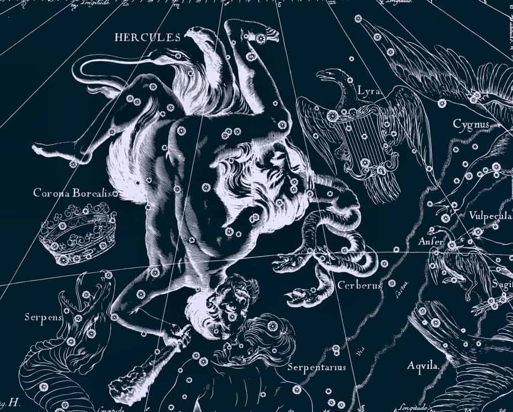Теперь же он светит нам с небес в окружении диковинных животных и чудовищ, которых победил, так сказать, «в процессе». Здесь и Гидра из озера Лерна близ Арголиды, у которой взамен каждой отрубленной головы тут же вырастали две новые; и немейский Лев с непробиваемой шкурой, которого Гераклу пришлось, в итоге, просто задушить; и Дракон (в этой версии толкования названий созвездий это не тот дракон, которого победил Ясон, добывая золотое руно, а тот, который охранял яблоки Гесперид, – это 12-й подвиг Геракла); и Орёл, каждый день клевавший печень прикованного к скале Прометея, – «чудо-птицу» тоже убил наш герой.