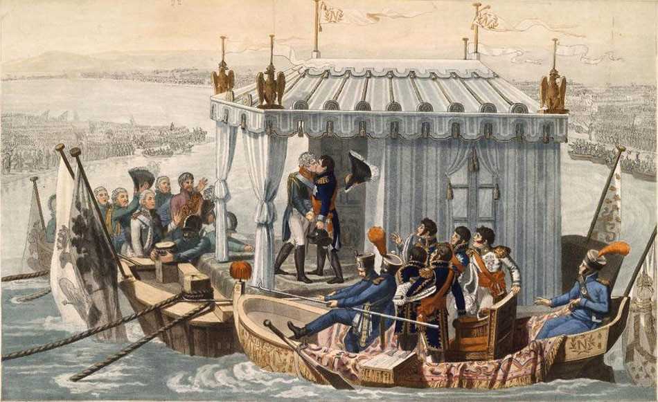 «Воды Немана отражали Наполеона на вершине славы» — писал о свидании Александра и Наполеона 25 июня 1807 года секретарь французского императора Луи Бурьен. Предложение Александра I заключить перемирие с Францией было удачей для Наполеона — после решительной победы при Фридланде французский император мог начать переговоры с позиции силы, тем более Россия только что ввязалась в очередную войну с Турцией, требовавшей внимания, расходования сил и средств.