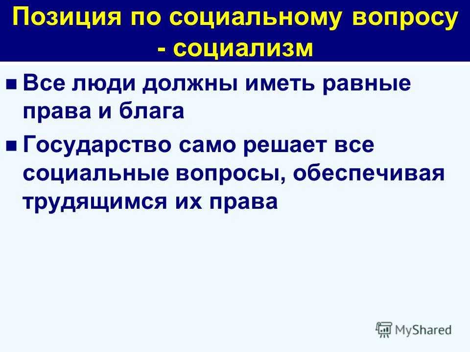 Позиция по социальному вопросу — социализм Все люди должны иметь равные права и блага Государство само решает все социальные вопросы, обеспечивая трудящимся их права
