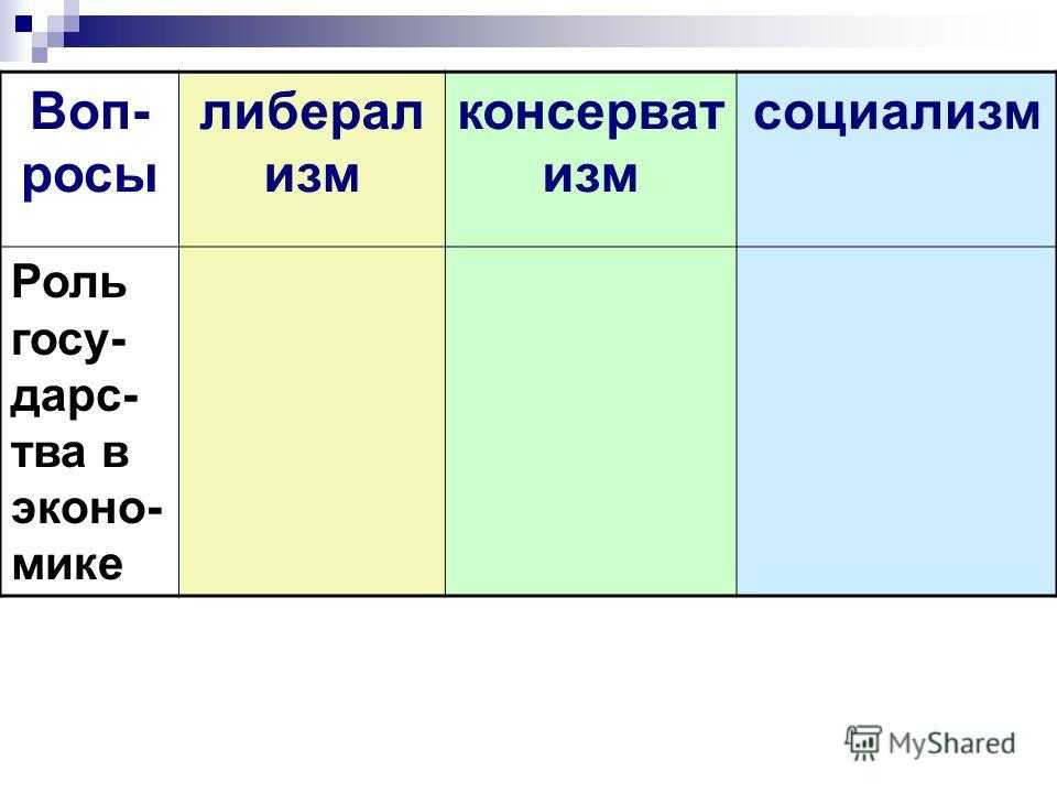 Воп- росы либерал изм консерват изм социализм Роль госу- дарс- тва в эконо- мике