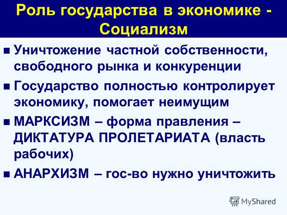 Роль государства в экономике — Социализм Уничтожение частной собственности, свободного рынка и конкуренции Государство полностью контролирует экономику, помогает неимущим МАРКСИЗМ – форма правления – ДИКТАТУРА ПРОЛЕТАРИАТА (власть рабочих) АНАРХИЗМ – гос-во нужно уничтожить