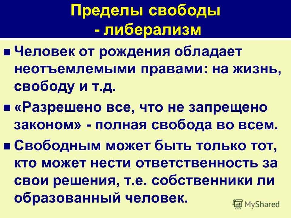 Пределы свободы — либерализм Человек от рождения обладает неотъемлемыми правами: на жизнь, свободу и т.д. «Разрешено все, что не запрещено законом» — полная свобода во всем. Свободным может быть только тот, кто может нести ответственность за свои решения, т.е. собственники ли образованный человек.