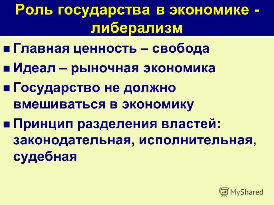 Роль государства в экономике — либерализм Главная ценность – свобода Идеал – рыночная экономика Государство не должно вмешиваться в экономику Принцип разделения властей: законодательная, исполнительная, судебная