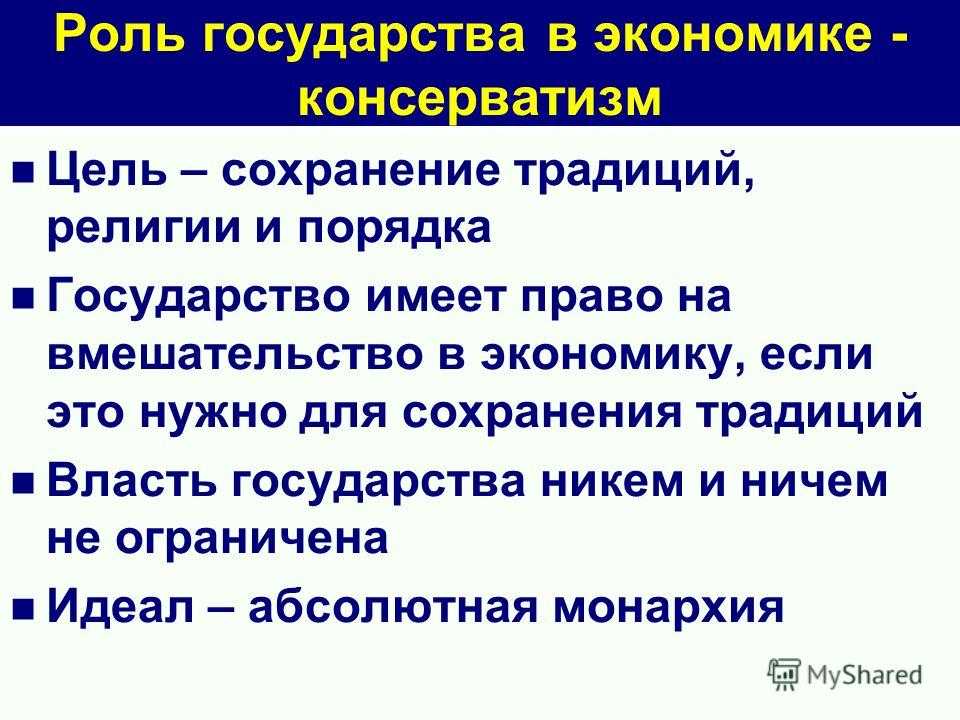 Роль государства в экономике — консерватизм Цель – сохранение традиций, религии и порядка Государство имеет право на вмешательство в экономику, если это нужно для сохранения традиций Власть государства никем и ничем не ограничена Идеал – абсолютная монархия