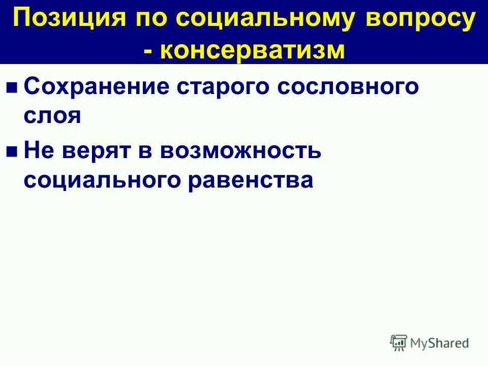 Позиция по социальному вопросу — консерватизм Сохранение старого сословного слоя Не верят в возможность социального равенства