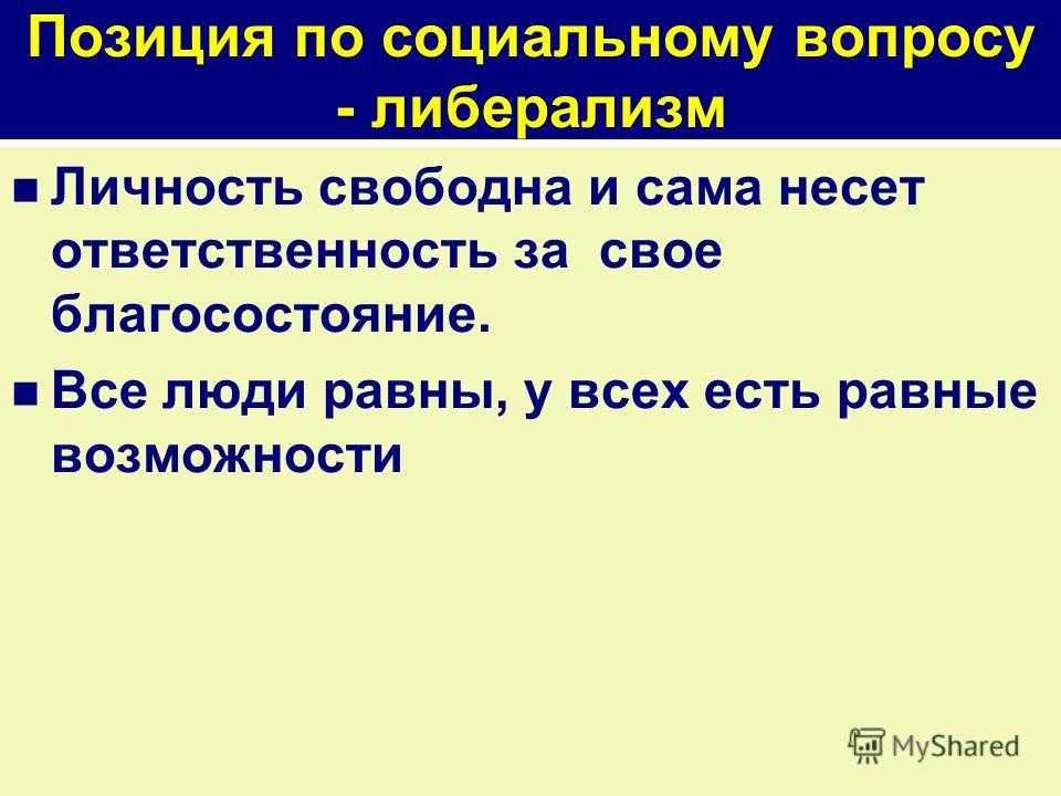 Позиция по социальному вопросу — либерализм Личность свободна и сама несет ответственность за свое благосостояние. Все люди равны, у всех есть равные возможности