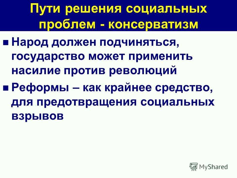 Пути решения социальных проблем — консерватизм Народ должен подчиняться, государство может применить насилие против революций Реформы – как крайнее средство, для предотвращения социальных взрывов