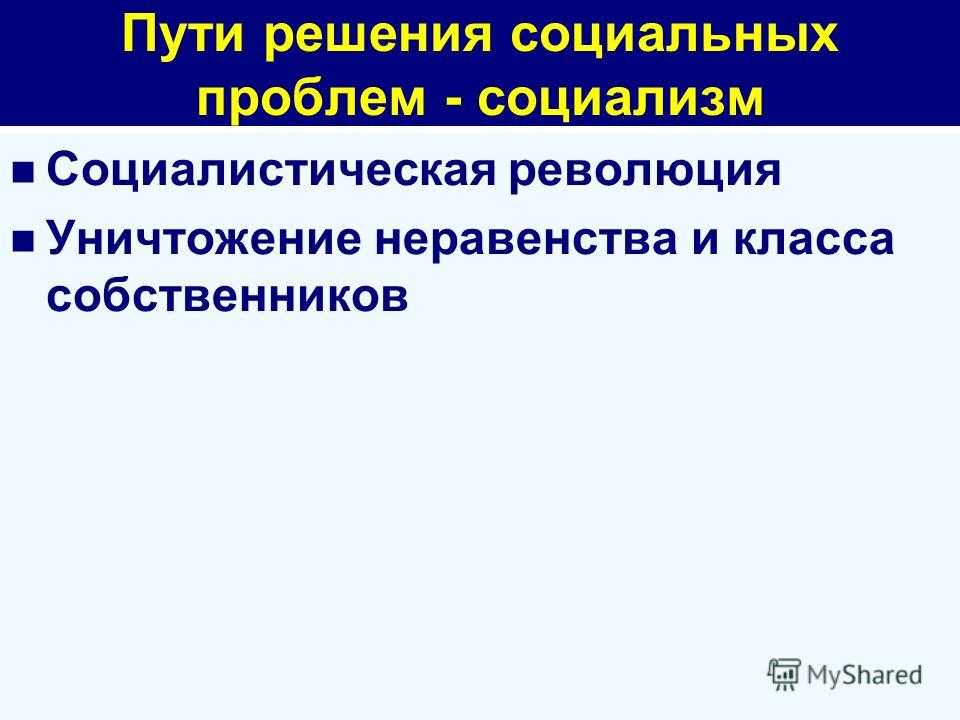 Пути решения социальных проблем — социализм Социалистическая революция Уничтожение неравенства и класса собственников