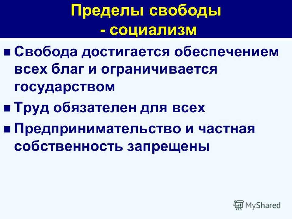Пределы свободы — социализм Свобода достигается обеспечением всех благ и ограничивается государством Труд обязателен для всех Предпринимательство и частная собственность запрещены