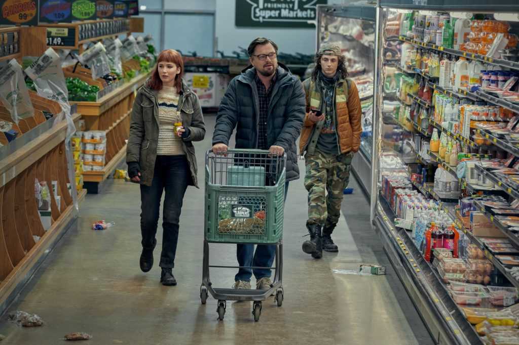 Дженнифер Лоуренс, Леонардо ДиКаприо и Тимоти Шаламе в фильме «Не смотрите наверх» (2021)