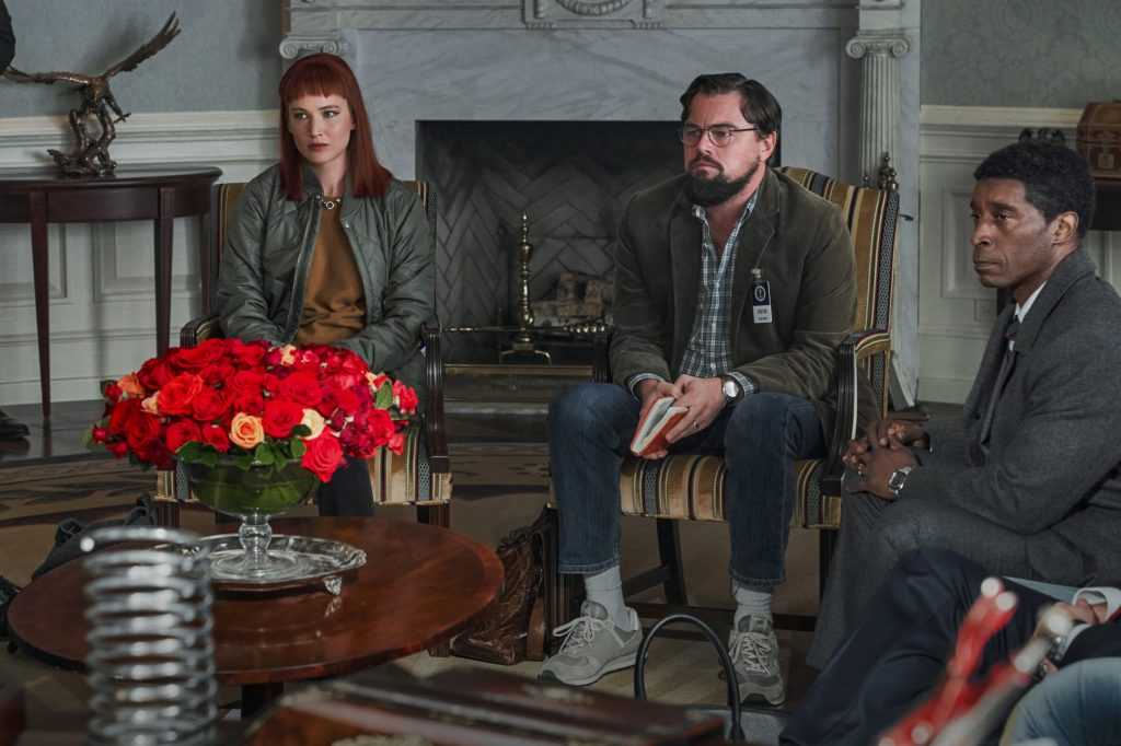 Дженнифер Лоуренс, Леонардо ДиКаприо и Роб Морган в фильме «Не смотрите наверх» (2021)