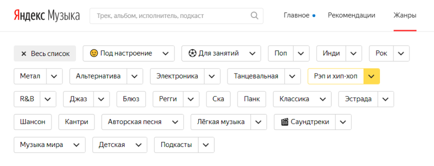 Посмотрите, каким количеством жанров ограничилась Яма. Например «Рэп и хип-хоп» бывает только зарубежный и русский. Для сравнения, список поджанров из общедоступной «Википедии» насчитывает 24 вида, это при условии, что «Википедия» ничего не знает про русский рэп.