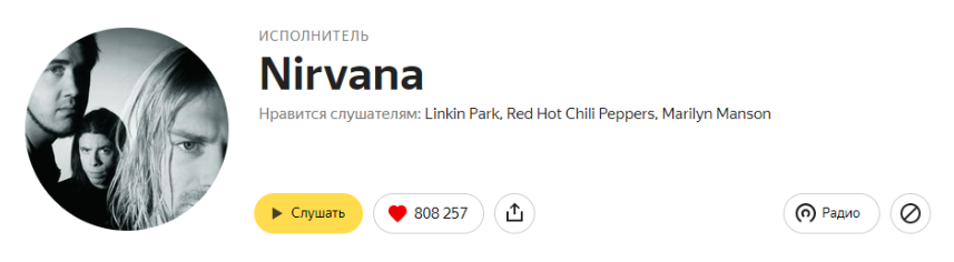 Самая важная и самая провальная часть Яндекс.Музыки. Убедиться в этом просто, достаточно зайти на страницу любой очень популярной группы, например, Nirvana.