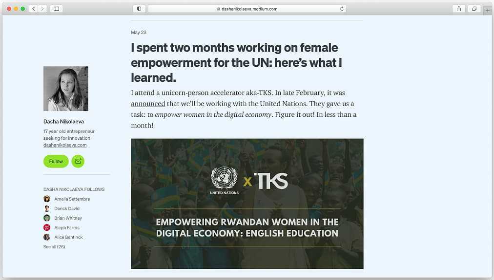 Даша ведёт блог на платформе Medium, где рассказывает про проекты