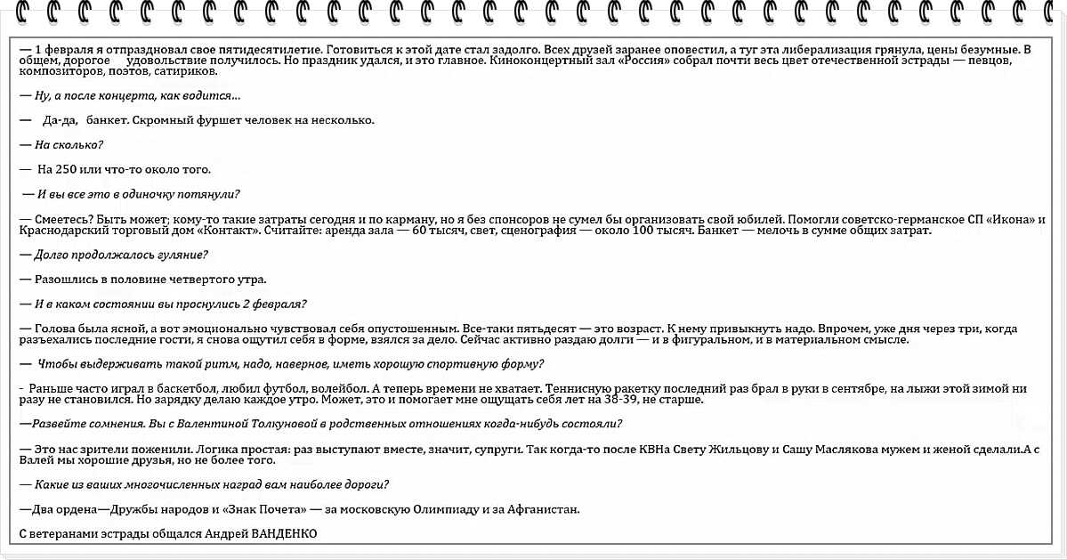 Видно, что мы остаемся пока в теме юбилея. Но как-то концерт перешел в пьянку. Читаем дальше следующий абзац и видим, что мы пытаемся все же втянуться в тему концерта. Но журналист не дает этого сделать и спрашивает:
