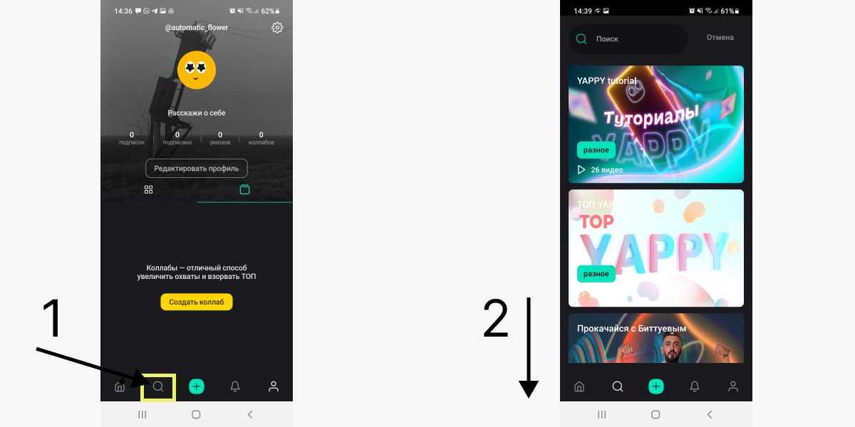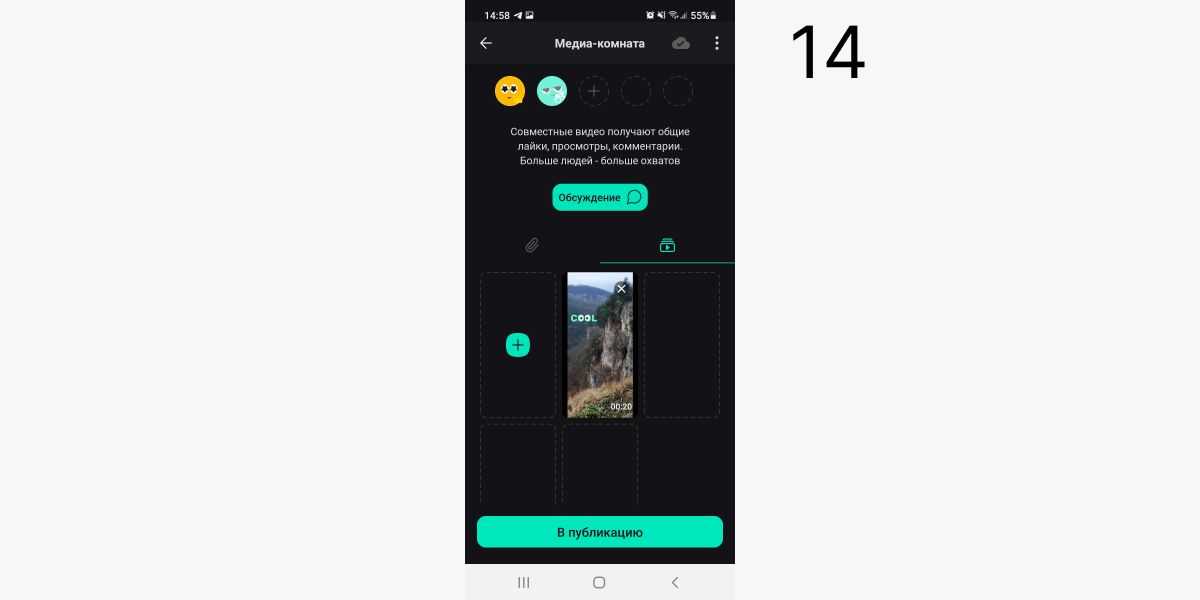 На странице профиля кликните «Создать коллаб», затем смахните влево и нажмите на плюсик, чтобы загрузить готовые ролики из галереи. Коллаб в Яппи – это совместный вертикальный ролик с другим пользователем. Создать его можно даже без специального разрешения от автора.