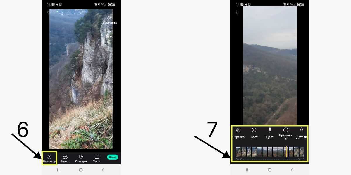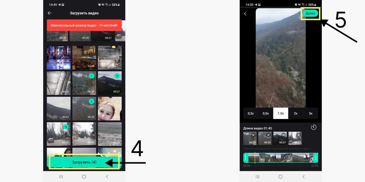 После загрузки роликов вы можете их ускорить, повернуть либо удалить лишние. Когда будете готовы загрузить видео, нажмите «Далее».