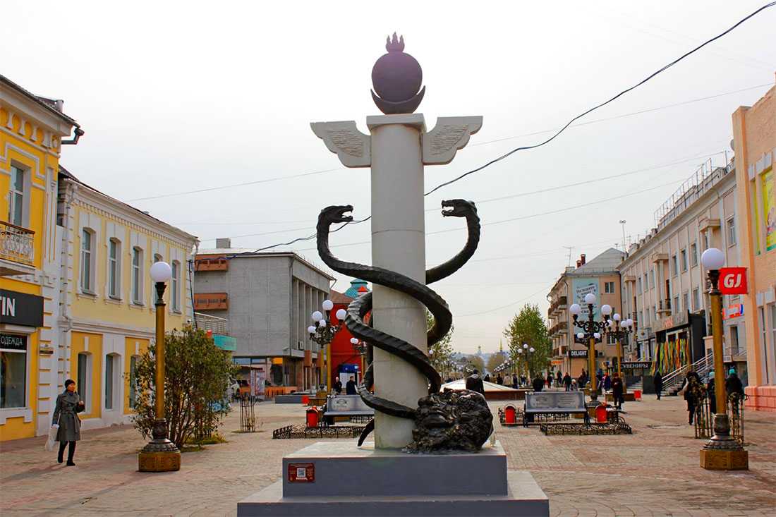Обратите внимание на «Дом с атлантами» – особняк купца Капельмана, украшенный колоннами и фигурами в античном стиле. На Бурятском Арбате также есть фонтан, несколько скульптур и лавочки для отдыха