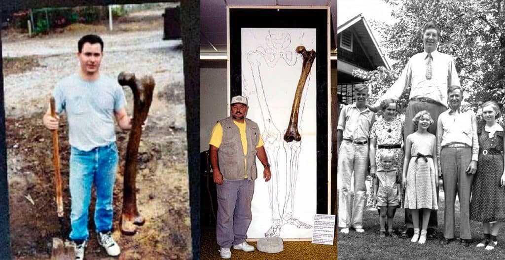 Найденная кость, предположительно принадлежавшая человеку ростом около 5 метров. Справа — Роберт Водлоу, великан из штата Иллинойс, был самым высоким человеком в истории — рост 272 см.