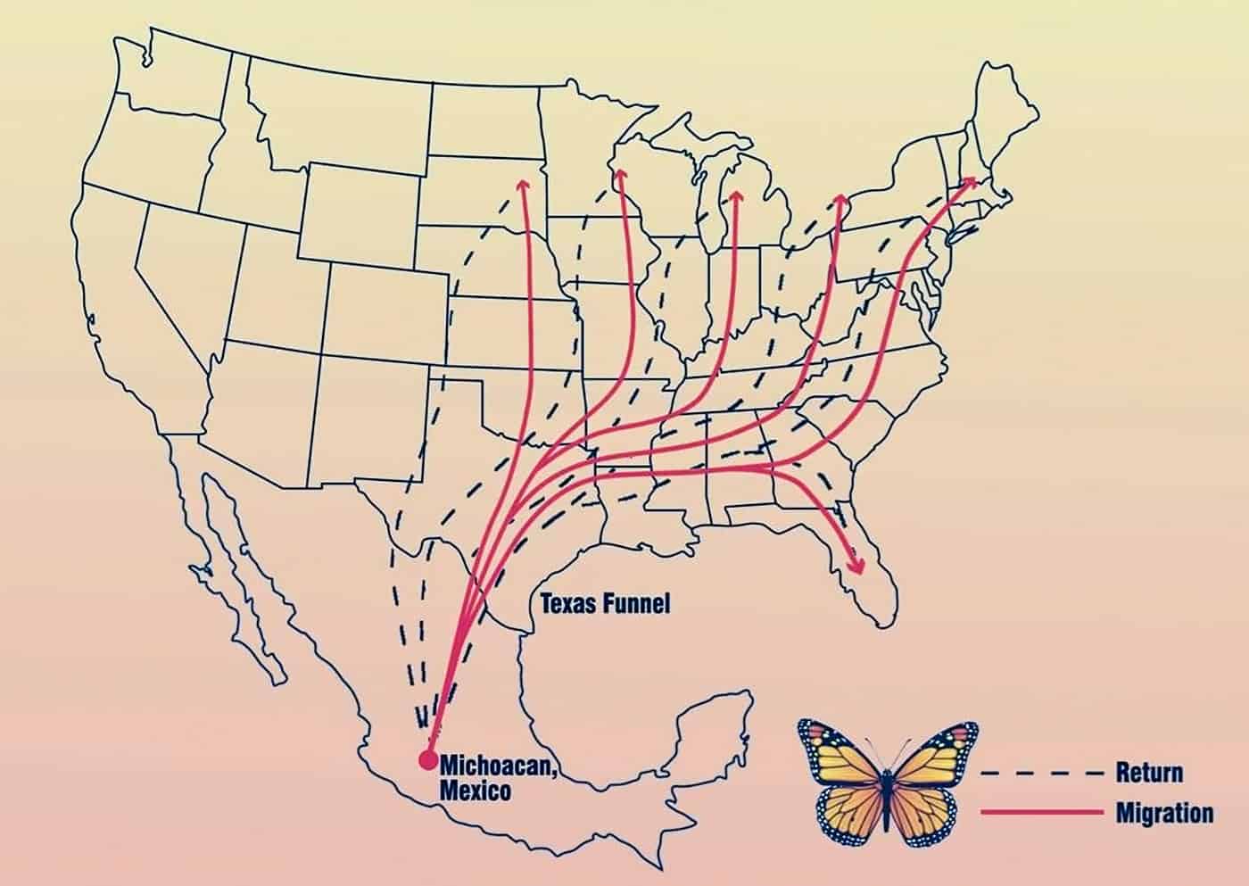 Каждый год насекомые, с ярко раскрашенными крыльями, летят в Мексику, тратя на перелёт ни много, ни мало, а восемь месяцев. Для чего насекомые совершают такие немыслимо дальние для них перелёты учёным установить пока не удалось. Интересно, что в Мексику прилетает только пятое поколение уже бывавших здесь красивых бабочек, и как они находят место зимовки своих красочных предков до сих пор остаётся неразрешимой загадкой. Предполагается, что насекомыми во время миграции используются северные ветра, и они анализируют свет солнца в зависимости от его положения на небосклоне.