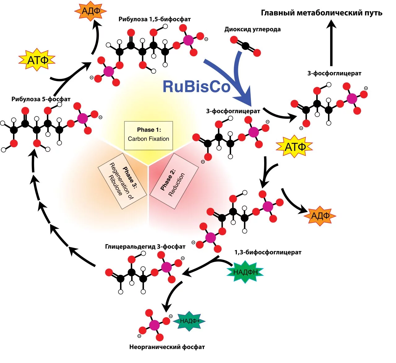В третьей стадии участвуют 5 молекул ФГА, которые через образование 4-, 5-, 6- и 7-углеродных соединений объединяются в 3 5-углеродных рибулозо-1,5-бифосфата, для чего необходимы 3АТФ.