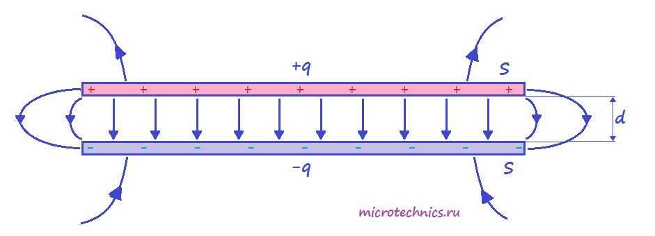 А поскольку на обкладках сосредоточен заряд, между ними возникает электрическое поле. Поле плоского конденсатора, в основном, сосредоточено между пластинами, однако, в окружающем пространстве также возникает электрическое поле, которое называют полем рассеяния. Очень часто его влиянием в задачах пренебрегают, но забывать о нем не стоит.