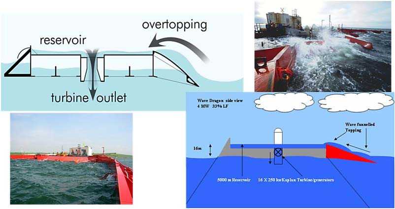 Принцип «перелива» (overtopping) (рис. 12). Устройство содержит резервуар, который заполняется волновым движением. Вода с резервуара сливается на более низкий уровень и вращает турбину.