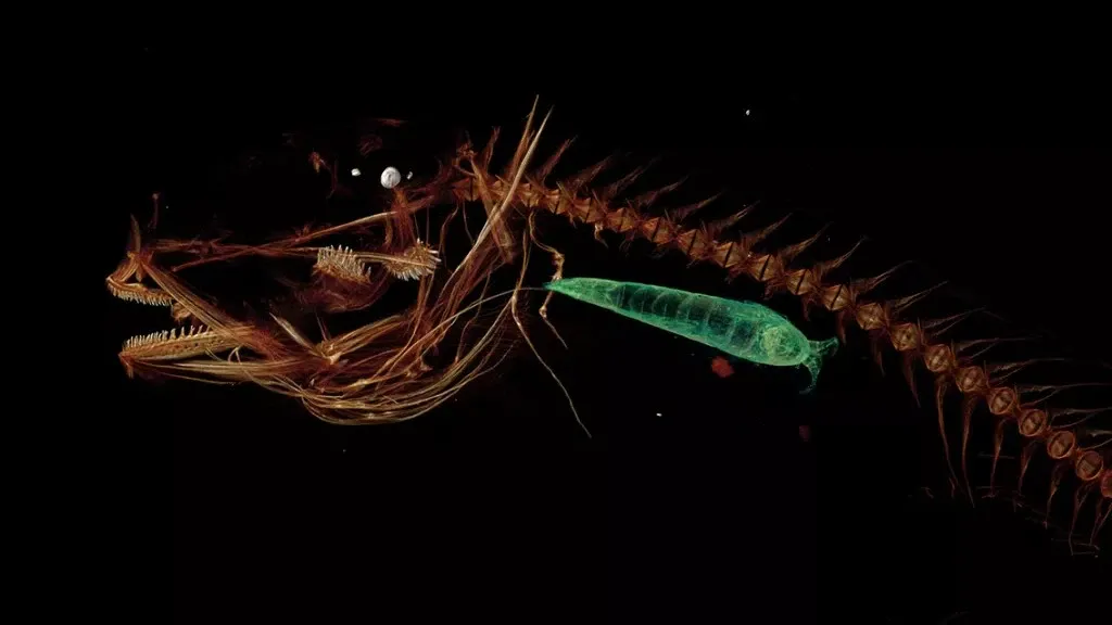 Оранжевым цветом показаны очертания Pseudoliparis swirei. Если смотреть слева, то у нее большая голова, слегка заостренная, с множеством тонких острых зубов. Сзади виден длинный позвоночник. Под позвоночником и внутри желудка находится маленькое, но толстое червеобразное существо с маленькими усиками зеленого цвета. (Иллюстрация: Адам Саммерс / Вашингтонский университет).