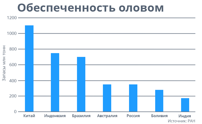 Некоторыми металлами (медь, никель, олово, вольфрам, молибден, тантал, ниобий, кобальт, скандий, германий, платиноиды, железо) наша страна обеспечена более чем на 15 лет; другими (свинец, сурьма, золото, серебро, алмазы, цинк) — на 10–15 лет. Есть дефицитные металлы: уран, марганец, хром, титан, алюминий, цирконий, бериллий, литий, рений, редкие земли иттриевой группы, запасы которых либо уже исчерпаны или находятся на грани исчерпания. И хотя по геологическим запасам целого ряда металлов Россия входит в первую пятерку или десятку стран мира, когда дело касается их добычи, ситуация меняется. Например, это касается олова.