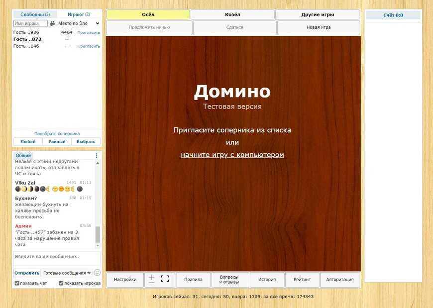 Бесплатный и высокографичный сервис с хорошим звуковым оформлением, русским меню и отсутствием обязательной регистрации. Сайт позволяет играть в Козла и Осла на 2-4 игроков с ботами и живыми соперниками. Есть возможность командной битвы, настройки индивидуальных параметров (какие косточки, сколько штук, сколькими играть и т.д.).